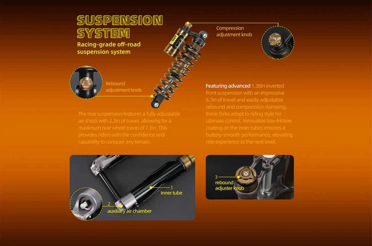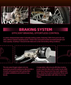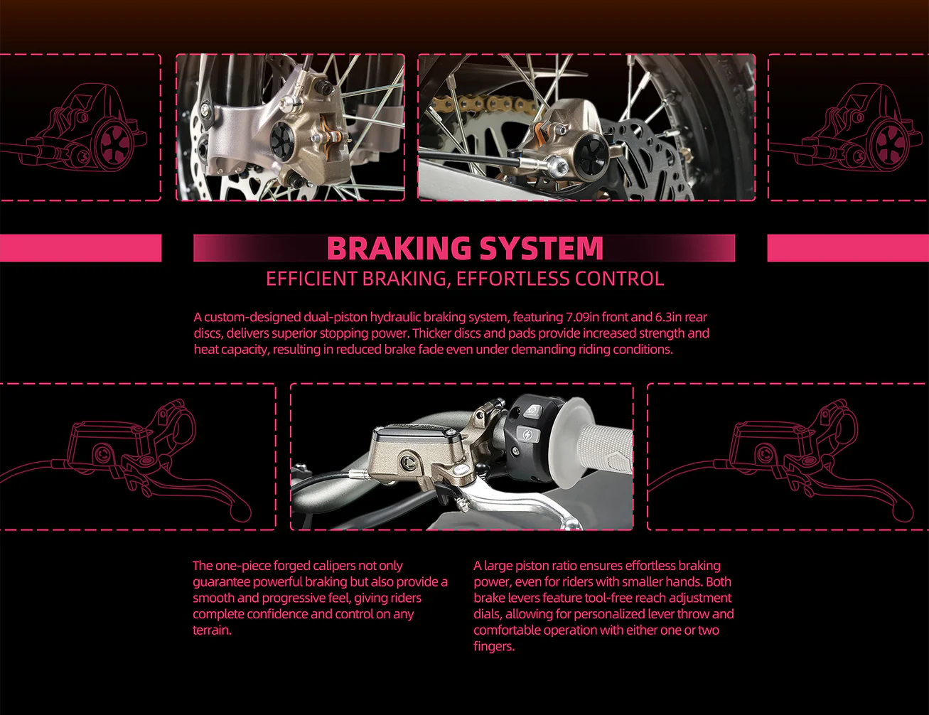 The cutting-edge power system features high-performance 21700 batteries packed with energy, advanced MTPA/MTPV controllers, and an integrated magnetic cylinder longitudinal motor. Paired with a newly designed angular reducer, it delivers smooth and direct power transmission. Striking the perfect balance between powerful performance and refined control, the system is safe, reliable, and built for effortless maintenance. surron hyper bee specs